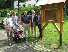Unser Foto zeigt die sehenswerte Schautafel mit dem Schriftzug "Gerichtsort bis 1849" und von li. Ortsvorsteher Franz Grae, Sascha Reker als Vertreter des Heimatvereins, Gastwirt Franz-Josef Pöppelbaum, der die Tafel gestaltet hat, Ideengeber Gerhard Henneke sowie Tischlermeister Robert Holle als Erbauer der Eichenkonstruktion.