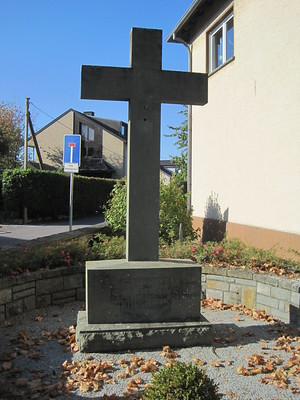 In einer das Kreuz einfassenden Ziermauer befinden sich zu beiden Seiten des Kreuzes zwei Steininschriften, welche lauten:
