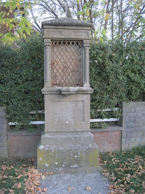 Zusatz: Der Bildstock weist eine bemerkenswerte Besonderheit auf. Ein aus Terrakottamaterial hergestelltes Relief zeigt die Niederkunft des hl. Geistes ( in Form der Taube) im Obergeschoss des Saales zu Jerusalem. Zu Ihren Füßen sitzen die 11 Jünger; ohne Judas.