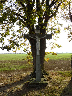 Sie stehen vor einem steinernen Kreuz mit Korpus. Neben der befestigten Straße etwa 4 m abseits steht das Kreuz hinter einer leichten Strassenmulde. Sie können das Kreuz anfassen. Eine mächtige Linde mit Durchmesser 60 cm steht hinter dem Kreuz und bildet so in der Landschaft die typische Einheit Kreuz und Baum. An der Rückseite ist das Kreuz mit einer dicken Eisenstange gegen Umfallen gesichert.