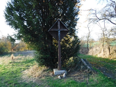 Sie stehen vor einem Holzkreuz mit einem Korpus aus Metall. Sein Standort liegt abseits von der Landstraße nach Norden. Sie gehen 8 m über eine grasbewachsene Fläche, etwas abschüssig. Kleine Unebenheiten erfordern beim Gehen etwas Vorsicht.