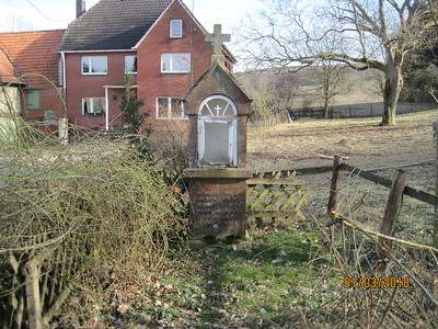 Nun werden Sie erstaunt sein, 2 Fotos. Sie haben recht, der Bildstock wurde im Rahmen der Restaurierung von der einen Straßenseite zur anderen Straßenseite versetzt. Sie stehen vor einem Bildstock der kleineren Bauart. Mit seiner spitzgiebeligen Ausbildung als Dach und aufgesetztem kleinen Kreuz misst der Bildstock etwa 2 m Höhe. Der eingelassene Tabernakel ist mit einem kleinen Fenster gegen die Witterung geschützt. Im Rahmen der Restaurierungsarbeiten wurde das alte morsche Eichen-Holzfenster gegen ein neues Fenster aus Stahl ausgetauscht.