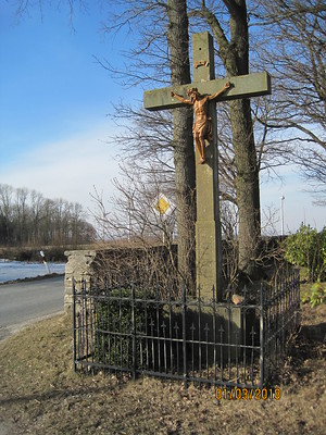 Sie stehen vor einem mächtigen Steinkreuz am südlichen Hofrand einer mit Bäumen bewachsenen kleinen Waldfläche, ein kleiner Teich ist ebenfalls vorhanden.