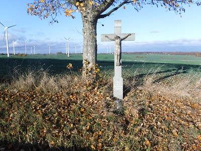 Das Kreuz steht abseits vom befestigten Wirtschaftsweg hinter dem Straßengraben. Die vorderseitige Inschrift lautet: " Mein Jesus Barmherzigkeit".