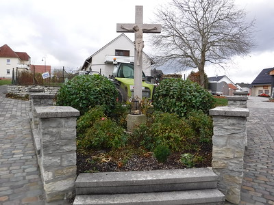 Sie stehen vor einer mit einer Bruchsteinmauer eingefriedeten Grünanlage von etwa 2 mal 4 m. Das Grundstück ist mit einigen Koniferen und Bodendeckern bepflanzt und wirkt gepflegt. Inmitten der Anlage steht ein steinernes Kreuz. Offenbar handelt es sich um ein aus Beton gegossenes Kreuz. Der Corpus ist aus gleichem Material hergestellt.