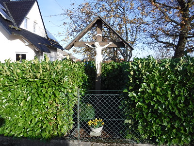 Sie stehen vor einem gepflegten Holzkreuz, das etwa 1 m im Garten steht. Über den seitlichen Splittstreifen können Sie bis unmittelbar anden kleinen Gartenzaun gehen.Das Holzkreuz mit Corpus ist duch ein kleines blechbeschlagenes Dach gegen Regen etwas geschützt.