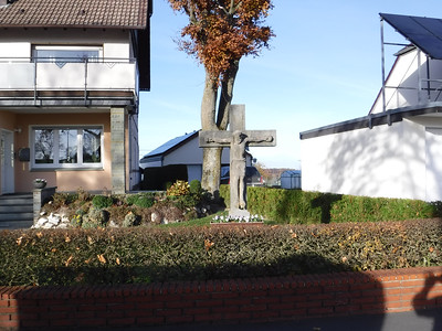 Sie stehen vor einem steinernen Kreuz, bei dem sowohl das Kreuz wie auch der Corpus aus Beton gegossen sind. Der Standort liegt etwa 1 m im Garten, das Fundament wird etwas verdeckt durch eine niedrige rote Berberitz-Hecke. Das Fundament ist aus Anröchter Bossensteinen errichtet. An der Rückwand des Fundamentes ist eine glatte Steinplatte eingebaut mit der Inschrift: