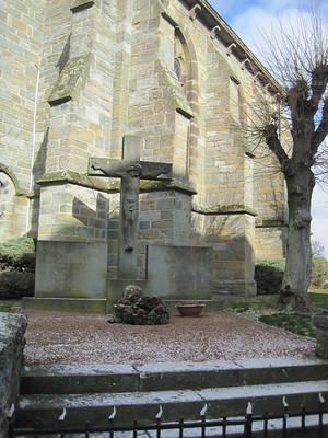 Sie stehen vor dem Ehrenmal der Kliever Bürger; daran ist besonders auffällig das mächtige Steinkreuz mit Corpus; ebenfalls aus Stein gemeißelt als Dreinagelcorpus.