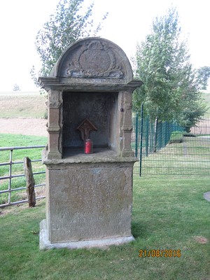 Der Bildstock weist einen halbkreisförmigen Bekrönungsstein mit schöner Inschriftenkartusche auf.