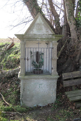 Sie stehen vor einem barockartigen Bildstock aus Grünsandstein. Der Bildstock steht unmittelbar am Wegesrand und kann angefasst werden. Wenn auch mit einem Gitter der Neuzeit abgesichert, ist der Tabernakel doch groß genug, große sakrale Gegenstände ( Monstranz) aufzunehmen.