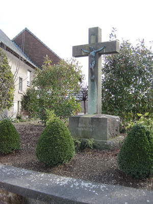 Sie stehen vor einem gepflegten Kreuz, schlicht und wohlproportioniert in seiner Ausführung mit einem Corpus aus Metall.