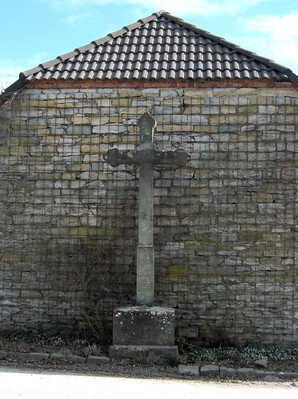 Sie stehen vor einem Steinkreuz, dessen Errichtung auf das Jahr 1948 zurückgeht.