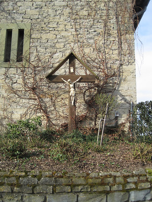 "Einen ebenfalls lieben Wunsch meiner Mutter konnte ich im Winter 1976 erfüllen. Ihr Wunsch ein Kreuz mit Korpus und Blumenbeet ging in Erfüllung. 2 ganz alte Eichenbalken, die schon Jahre im Teich bei Schloss Körtlinghausen lagen, besorgte mir Josef Dohle. Nachdem sie ausgetrocknet waren, habe ich mühsam alle Nägel herausgezogen und sie dann zu 2 Kreuzbalken vor der Säge geschnitten. Das Querholz wurde anschließend millimetergenau in das aufrechte Holz eingepasst. Nachdem die Hölzer die genaue Länge hatten, habe ich sie mit dem Schleifgerät bearbeitet, bis jede Stelle glatt war. Für die dachmäßige Abdeckung über Kreuz und Korpus schnitt ich die Eichenbretter zurecht. Das gesamte Holz wurde mehrmals mit Holzschutzmitteln behandelt und dann zusammengefügt. Am jetzigen Standort stand bis dahin ein großer Fliederstrauch. Er wurde gerodet und die Fläche mit Mutterboden aufgefüllt. Als Stativ und für die Festigkeit goss ich ein Betonfundament in die Erde. In diese waren 4 Flacheisen für die Befestigung des Kreuzes eingelassen. Den Korpus habe ich von einer Fachfirma aus Bayern gekauft und dann angebracht. Zum Karfreitag 1976 war das fertige Kreuz aufgestellt und auch einige Stauden und Blumen angepflanzt.- alles zur Ehre Gottes!!