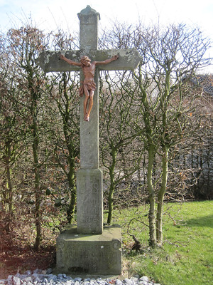 Sie stehen vor einem mächtigen Steinkreuz, das vor einigen Jahren einen neuen Corpus erhielt. Die Balkenenden sind bildhauerisch aufwendig bearbeitet.