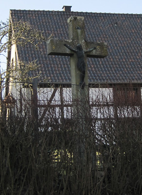 Das Haus der Familie Lukas - jetzt Eigentum der Familie Wäsche mit Steinkreuz im Garten.