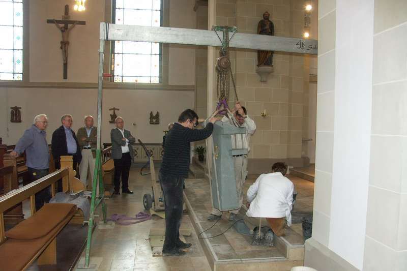 Mit der Aufstellung des neuen Ambo in der Pfarrkirche Sankt Alexander zu Mellrich sind die Arbeiten im Chorraum größtenteils beendet. Die Arbeiten wurden sach- und fachkundig von der Firma Schütte ausgeführt. Aufmerksame Beobachter waren (v.r.)Pfarrer Norbert Tentrup, stv. Kirchenvorstandsvorsitzender Ewald Marx, Kirchenvorsteher Heinz-Josef Körtling und Schreinermeister Clemens Schäfers. Nun hofft man im Kirchenvorstand, dass die restlichen Arbeiten rechtzeitig bis zum kommenden Wochenende beendet sind, denn am Samstag, 2. September soll die Vorabendmesse um 18.45 Uhr wieder in der Pfarrkirche stattfinden.