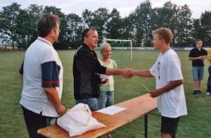 gewonnen hatte, überreichte an die siegreichen Mannschaften Präsente.