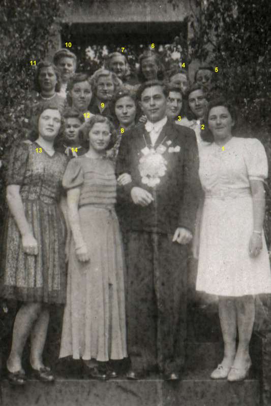 Hofdamen: 1. Hilde Marx, 2. Margreth Sehrbrock geb. Johannknecht, 3. Thea Viezenz geb. Bäumer, 4. Elfi Rubarth geb. Neuhaus, 5. Luise Rodejohann geb. Voß, 6. Elsbeth Beyer geb. Peitzmeyer, 7. Ruth Janßen geb. von Wrede, 8. Else Schürmann geb. Levenig, 9. Hannelore Kußmann geb. Dicke, 10. Maria Hölzer geb. Sehrbrock, 11. Maria Hoffmann geb. Prasse,