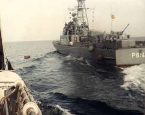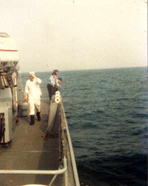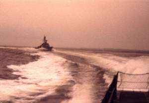 Manöver auf See, Fahrt im Kielwasser (der Farbe nach offenbar im Roten Meer)