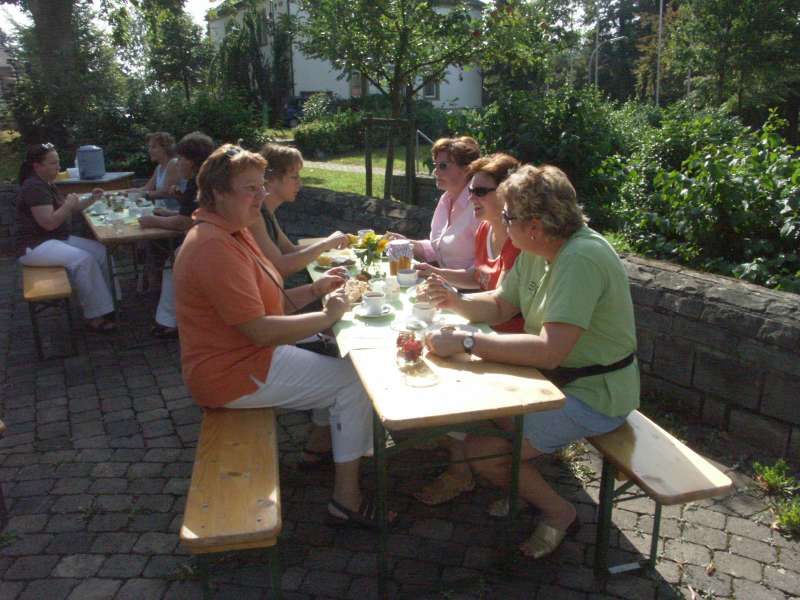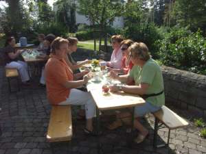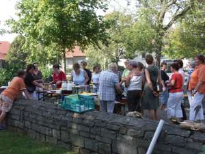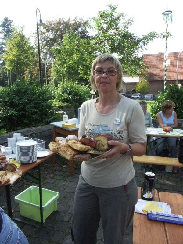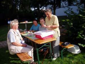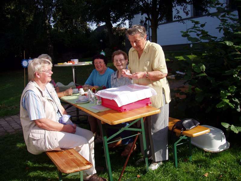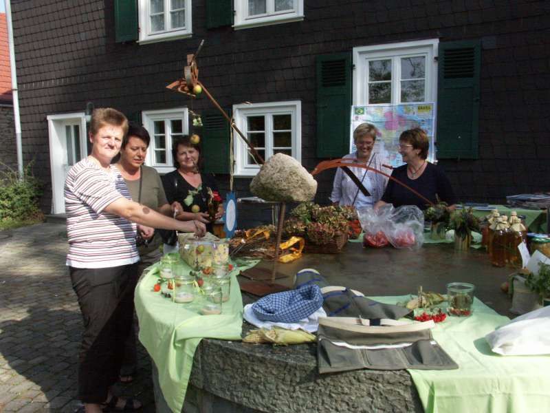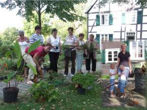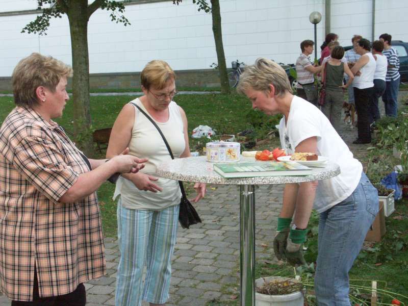 Buntes Treiben und gute Stimmung herrschten während des 3. Gartentages, den die kfd des Kirchspiels Mellrich am Franz-Drepper-Haus organisierte. Sichtlich erfreut war der kfd-Vorstand über die große Zahl der Besucher, die nicht nur aus dem Kirchspiel Mellrich, sondern u.a. auch aus Lippstadt, Bad Westernkotten, Warstein, Stirpe und Anröchte am vergangenen Wochenende nach Mellrich kamen. Die Gartenliebhaber hatten eine große Auswahl von Stauden aus den heimischen Gärten und reichhaltig war auch das Angebot an eingemachten Leckereien. Herbstliche Dekorationen wie geschmackvoll gestaltete Kränze fanden reißenden Absatz. Bei Kaffee und Kuchen, Pellkartoffeln mit Kräuterquark und herrlichem Spätsommerwetter verlief der 3. Gartentag sehr harmonisch. Maria Hoff, die zur Glücksfee erwählt worden war, zog das Los von Elisabeth Süggeler, die Paule, den Vogel aus Stein und Eisen, ihr eigen nennen darf und ihn als "Gartenwächter" in ihrem Garten platzieren wird. Das kfd-Vorstandsteam: Wir sind froh und dankbar für die großartige Mithilfe und Unterstützung, durch die der 3. Gartentag zu einem vollen Erfolg wurde. Mit dem Erlös des 3. Gartentages in Höhe von etwa 1.700 EUR wird die Arbeit von Maria Bürger unterstützt, die als Missionarin auf Zeit im Nordosten Brasiliens in einer Landwirtschaftsschule bei einem Straßenkinderprojekt mitarbeitet.