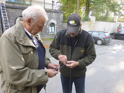 Ein paar Jungen fragten, was wir denn da machten, und waren dafür nach einigem Zögern auch bereit, ihr Fußballspiel kurz zu unterbrechen. Peter und Alfred als pensionierte Pädagogen erklärten in einem zweiminütigen Schnellkurs die Grundlagen des Amateurfunks. Die Jungs nickten und dachten sich wohl, dass es mit dem Handy doch einfacher ging. Schließlich wurde mit Schäkeln, Kauschen und Seemannsknoten (Peter als Segler kannte sich da aus) das entfernte Ende der Antenne befestigt. Zufrieden konnten die vier Akteure anschließend im OV-Heim die Funktionsfähigkeit der Antenne feststellen.