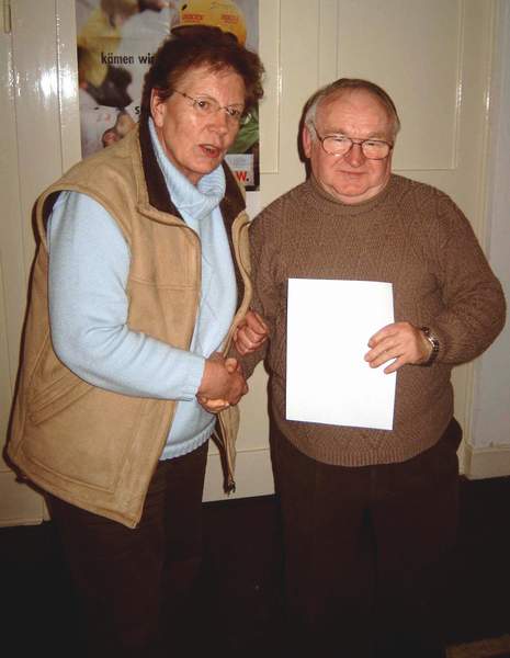 im Mittelpunkt der Jahreshauptversammlung des DARC-Ortsvereins Belecke im Haus Dassel. Unter dem Beifall aller Gäste gratulierte 1. Vorsitzende Ingrid Schmidt Herbert Seidelmann - Rufzeichen: DJ5RK - zu seinem stolzen Jubiläum und überreichte ihm ein Präsent. Ausführlich würdigte die Vorsitzende die Verdienste des Jubilars: "Der gelernte Techniker und sehr aktive Funkamateur Herbert Seidelmann gehört unserem Ortsverein seit 50 Jahren an. Er war neben dem Betrieb auf der Kurzwelle vor allem am Aufbau des internationalen digitalen Packet-Radio-Netzes der Funkamateure beteiligt und hat einen wesentlichen Anteil an der Errichtung und Wartung von Sendestationen unter anderem auf dem Stimm-Stamm, auf dem Brocken und sogar in Tschechien und Polen. Wir danken ihm ganz herzlich für sein auch heute noch beispielhaftes Engagement und hoffen, noch lange auf ihn zählen zu können."