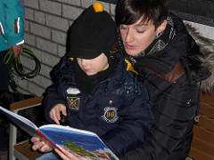 Ein lebendiger, dorfweiter Adventskalender, diese Idee fiel auf fruchtbaren Boden, und Ortsvorsteher Franz-Josef Grae ging mit gutem Beispiel voran. Eine beachtliche Schar von Einwohnern aller Geschlechter (früher gab es nur zwei) und jeden Alters begab sich auf den Weg zum Ortsvorsteher, und sicherlich waren alle gespannt, wie der Auftakt zur Adventskalender-Aktion denn wohl aussehen würde. Vor dem mit einer großen "1" geschmückten Fenster nahm die First Lady Sabrina Platz und las eine Nikolausgeschichte vor, die insofern ungewöhnlich war, als der Nikolaus hier nicht Geschenke verteilte, sondern einsammelte für ein Dorf in Afrika. Für die nötige Erleuchtung sorgte Söhnchen Anton, der seiner Mutter, auf ihrem Schoß sitzend, mit der Taschenlampe den Text ins rechte Licht rückte. Gegen die Kälte, die sich eigentlich im jahreszeitlichen Rahmen hielt, aber durch eine steife Brise etwas verschärft wurde, half ein Schnäpschen. Ein gelungener Auftakt, der zur Fortsetzung anregt.