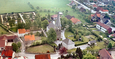 Vor 50 Jahren: Mellrich von oben, während eines Fluges über Mellrich im Bild festgehalten. Dorfbauliche Veränderungen haben das Ortsbild in den vergangenen fünf Jahrzehnten entscheidend geprägt. Auf dem Küstergartengrundstück an der Mittelstraße wurde 1992 der Dorfplatz angelegt. Im Pfarrhaus, das im vergangenen Jahr abgerissen wurde, residierte damals Pfarrer Gerhard Schulte - Ontrop. Die im Pfarrgarten auf Initiative des Geistlichen im Jahre 1963 errichtete Mariengrotte wurde wegen Baufälligkeit 1984 abgerissen. Das Kirchengelände mit seinem reichhaltigen Baumbestand hat sich entscheidend verändert. Das hinter der Alexanderschule errichtete Feuerwehrgerätehaus der Löschgruppe Mellrich entstand in den Jahren 1988 und 1989. In der Schulstraße (rechts oben im Bild) wurden in den vergangenen Jahren zwei Gebäude abgerissen und neue Wohnhäuser errichtet.