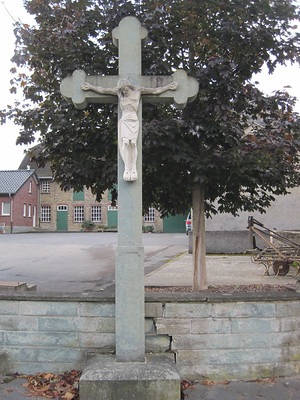 Das Steinkreuz mit Corpus und genasten Balkenköpfen steht auf einem Natursteinsockel. Der im oberen Schaftbereich angebrachte Titulus gibt
