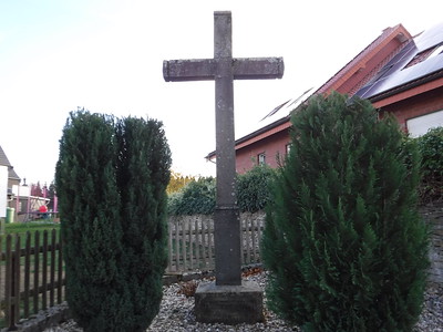 Sie stehen vor einem Stein-Kreuz in den Abmessungen 2,70 x 1,30 m, das etwa 2 m von der Straßenkante zurück im Garten steht. Das Gelände ist etwa 50 cm höher als die Straße, aber sonst frei zugänglich für den Kletterer. Zu beiden Seiten stehen je eine schmale aufrecht wachsende Konifere. An der Rückseite zum Garten ist ein niedriger Lattenzaun montiert.