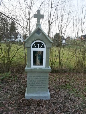Nun werden Sie erstaunt sein, 2 Fotos. Sie haben recht, der Bildstock wurde im Rahmen der Restaurierung von der einen Straßenseite zur anderen Straßenseite versetzt. Sie stehen vor einem Bildstock der kleineren Bauart. Mit seiner spitzgiebeligen Ausbildung als Dach und aufgesetztem kleinen Kreuz misst der Bildstock etwa 2 m Höhe. Der eingelassene Tabernakel ist mit einem kleinen Fenster gegen die Witterung geschützt. Im Rahmen der Restaurierungsarbeiten wurde das alte morsche Eichen-Holzfenster gegen ein neues Fenster aus Stahl ausgetauscht.
