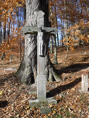 Sie stehen vor einem großen Kreuz, das auch wegen seines erhöhten Standortes im Wald dem Betrachter deutlich ins Auge fällt.