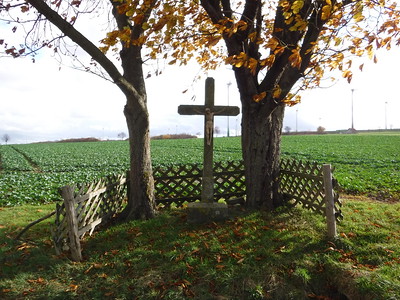 2,80 m und eine Breite von 1,20 m. Das Kreuzgrundstück wird seitlich und rückwärts begrenzt durch eine Lattenzaun. Beiderseits des Kreuzes stehen etwas zurückversetzt je ein Kastanienbaum Durchmesser 55 bzw. 70 cm. Man kann zum Kreuz hingehen, indem man die rechts liegende Zufahrt zum Acker betritt, die Oberfläche ist etwas uneben und mit Gras bewachsen.