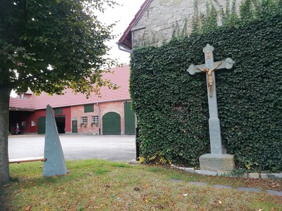 Dieses Kreuz wurde im Jahre 1923 von Frau Elisabeth Minter, geb. Weicken und ihren 3 Kindern Richard, Thea und Josef errichtet. Der Ehemann und Vater Josef Minter war im Jahre 1917 im Alter von 46 Jahren gestorben. Das Kreuz aus Anröchter Stein, mit einem schönen Corpus bekleidet, wurde in Erinnerung an die verstorbenen Vorfahren und zur Ehre des allmächtigen Gottes direkt an die Einfahrt zum Hof gesetzt.