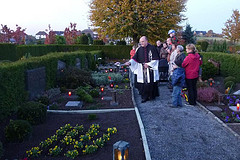 Nach seiner hörenswerten Predigt gedachte er der 26 seit dem letzten Allerheiligentag Verstorbenen. Für sie wurden auf dem Zelebrationsaltar als Zeichen der Erinnerung Lichter entzündet. Anschließend segnete Msgr. Dr. Menke-Peitzmeyer die Gräber.
