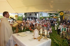 Als am 29. Juli 1977 das erste Mutter - Anna - Fest in Waltringhausen mit einer Andacht in der St. Anna-Kapelle eröffnet wurde und sich daran auf dem Hofe Mütel unter dem Motto "Unser Dorf ist unser Lebensraum", ein Sommerfest anschloss, dachte niemand daran, dass sich dieses Fest zu einem der beliebtesten Feste im heimischen Raum entwickeln würde. Nun feierte Waltringhausen in der Mitte des Dorfes sein 38. Mutter - Anna - Fest. Ungewöhnlich groß war die Zahl der Gläubigen, die der Einladung zum Festhochamt der Kapellenpatronin, der Hl. Mutter Anna, gefolgt waren. Darüber freute sich natürlich auch Pfarrer Waldemar Kolotzek, der gleich zu Beginn des Festhochamtes betonte: Sie haben hier schönes Wetter. Jeder so, wie er es verdient! Pfarrer Kolotzek stellte die Eltern der Gottesmutter Maria, Anna und Joachim, in den Mittelpunkt seiner teils zum Schmunzeln, aber auch nachdenkenswerten Festpredigt. Er wies dabei besonders auf den Wert und den Schutz des ungeborenen Lebens hin. Musikalisch umrahmt wurde der Gottesdienst wieder vom Musikverein Anröchte unter der Leitung von Heiko Röder.