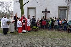 Während die Gemeinde in der Pfarrkirche das Palmsonntagshochamt feierte, versammelten sich die Kleinen und das Team im Franz-Drepper-Haus. Über ein Babyphone konnten Kinder wie Erwachsene die Messfeier in der Pfarrkirche mitverfolgen. Jüngstes Kind war Anjolie Grüne aus Klieve, das mit großen Augen interessiert in die Runde schaute. Gemeinsam beteten die Kinder: Wir sind heute Morgen hier, um miteinander zu beten, zu singen und von dir zu hören. In einem kleinen Rollenspiel wurde der Einzug Jesu in Jerusalem aufgeführt.