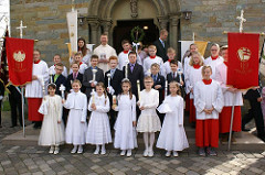Monatelang hatten sich 13 Mädchen und Jungen aus dem Kirchspiel Mellrich auf ihren Erstkommuniontag vorbereitet. Intensiv wurde ihnen dabei die Größe und die Wichtigkeit dieses Ereignisses vermittelt und schließlich wussten sie, "worauf wir bauen können". So lautete nämlich das Motto des Weißen Sonntages 2016. Im Franz-Drepper-Haus versammelten sich die Kommunionkinder, wo sie Marianne Diergarten und Wilfried Budde vom Pfarrgemeinderat schon erwarteten. Vom Pfarrheim wurden die Kommunionkinder bei schönem Frühlingswetter von Vikar Dariusz Klimanek, den Ministranten und den Fahnenabordnungen der Kirchspielvereinigungen abgeholt und in die Pfarrkirche Sankt Alexander geleitet. Hier empfingen während einer eindrucksvollen Messfeier, die wieder musikalisch von Laureen, Viktoria Köster und Organist Georg Weißnicht mitgestaltet wurde,