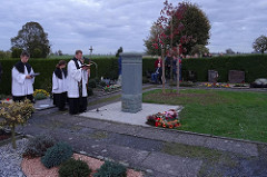 Seit dem Allerseelentag des vergangenen Jahres waren 18 Gemeindemitglieder aus dem Kirchspiel Mellrich verstorben. Ihrer wurde während der Allerseelenandacht in besonderer Weise gedacht. Beim Verlesen der Namen durch Vikar Dariusz Klimanek entzündeten Ministranten Kerzen zum Gedenken. Nach dem Gottesdienst erhielten auf dem Friedhof die neue Stele und das neu angelegte Urnengrabfeld durch Vikar Klimanek den kirchlichen Segen. Das anonyme Urnengrabfeld bietet Platz für 154 Urnen. Wie der Kirchenvorstand