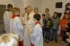 Pfarrer i.R. Dr. Heinrich Wieczorek freute sich über die Teilnahme der diesjährigen Kommunionkinder, die mit Aufmerksamkeit die Weihe des Osterfeuers und der Osterkerze verfolgten. Der Geistliche hatte in diesem Jahr auch die Karfreitagsliturgie gefeiert.