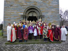 Eine überaus große Zahl von Jugendlichen und Kindern konnten Vikar Klimanek und Gemeindererferentin Schramm in der weihnachtlich geschmückten Pfarrkirche St. Alexander begrüßen. Vikar Klimanek sprach ihnen ein großes Lob dafür aus, dass sie, anstatt im warmen Bett liegen zu bleiben, sich auf den Weg zur Kirche gemacht hatten. Und nach dem feierlichen Entsendegottesdienst standen ja noch mühevolle Wege bevor. Bei windig-kühlem, immerhin trockenem Wetter sammelten die mit prächtigen Gewändern und Kronen geschmückten Kinder und Jugendlichen Geld für arme Kinder in Indien und bedankten sich mit der Segnung der Häuser der edlen Spender.