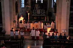 Die Feier der Osternacht zelebrierte in St. Alexander zum ersten Mal Vikar Johannes Sanders. In eindrucksvoller Weise erinnerte er die Gläubigen an die Auferstehung des Herrn. Für die Kommunionkinder war die Entzündung des Osterfeuers, das sie aus der Nähe beobachten konnten, ein besonderes Erlebnis.