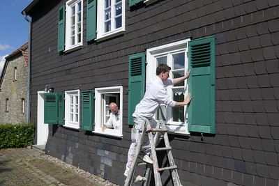 Nach Erteilung der denkmalrechtlichen Erlaubnis durch die Gemeinde Anröchte als Untere Denkmalbehörde begannen nun vor einigen Wochen die Arbeiten. Einige Fenster mussten teilerneuert werden und derzeit erfolgt der Anstrich der sanierten Fenster, aber auch der Blendläden. Die Kosten dafür belaufen sich auf rund 5.800 EUR.