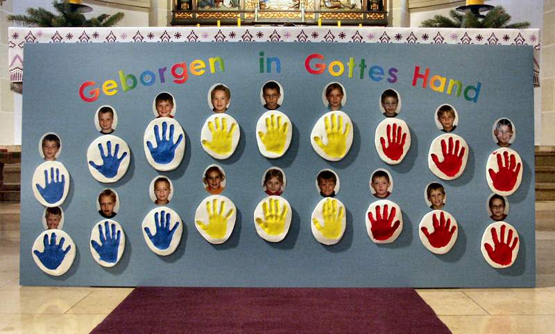 vor.. “Geborgen in Gottes Hand” So lautet das Motto der Erstkommunionvorbereitung. Auf einer Tafel haben die Jungen und Mädchen ihre Bilder und einen Handabdruck angeheftet - mehr als ein deutlicher Hinweis auf das Motto