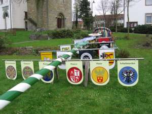 Bei nasskaltem Wetter fand sich eine passable Zahl Schaulustiger ein, darunter sehr viele Kinder, um mit dem neuen Vorstand des Heimatvereins die Aufrichtung des Maibaums zu feiern. Außer den Wappen der Mellricher Vereine war der Maibaum diesmal um die Zunftzeichen gegenwärtiger und früherer Mellricher Handwerksbetriebe erweitert worden, gestaltet von Verena Priesnitz (wir berichteten).