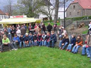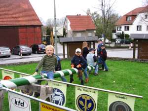 Der noch liegende Maibaum ist ein Kletterparadies für die Kleinen.
