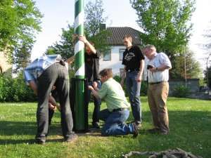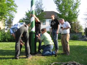 Diesmal hatte der Heimatverein wirklich Glück mit dem Wetter: Bei strahlendem Sonnenschein und hochsommerlichen Temperaturen wurde der Maibaum aufgestellt. Zahlreiche Schaulustige, darunter viele Kinder, ließen sich das Spektakel nicht entgehen.