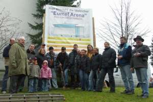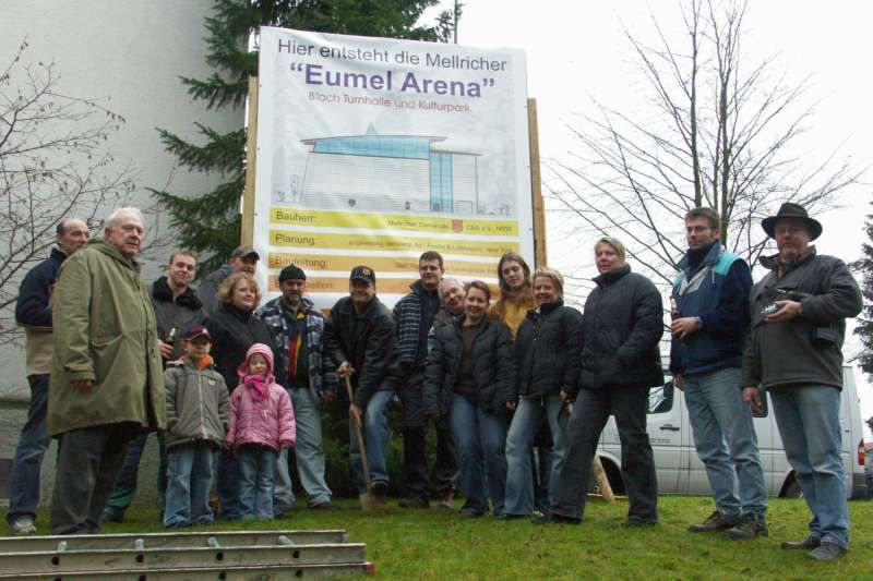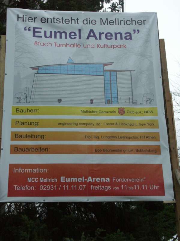 Seit über 40 Jahren redet man in Mellrich über den Bau einer Turnhalle. Das, was die Kommunalpolitiker in vier Jahrzehnten nicht geschafft haben, setzt der Mellricher Carnevals-Club beherzt und mutig um. In Zeiten leerer Kommunenkassen fasste der MCC den richtungweisenden Beschluss, die Turnhalle nun in Eigenregie zu bauen. Einheimische Vereine, Privatpersonen, Spendenaktionen, Bürgschaften, Förderverein standen wie ein Mann hinter dem Jahrhundertprojekt. Zudem veräußerte der MCC einige seiner umfangreichen Liegenschaften. Erstaunlich hoch waren die Spenden, so dass der MCC nun, man höre und staune, eine Achtfach-Turnhalle mit Kulturpark auf dem Pfarrhausplatz bauen kann. Wegen der Größe der neuen "Eumel-Arena" muss das Pfarrhaus weichen. Die Bauleitung hat Dipl. Ing. Ludgeros Levinopolus, Bauherr ist natürlich der MCC. Die Stararchitekten sind Liebknecht und Forster, die gerade die neuen Türme des Freedomtower in New York planen.
