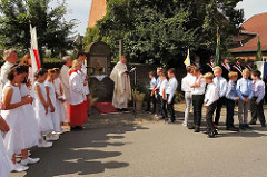 Für Vikar Dariusz Klimanek war es das erste Fronleichnamsfest, das der Geistliche im Kirchspiel Mellrich feierte. Zum Festhochamt begrüßte Vikar Klimanek die Fahnenabordnungen der Kirchspielvereine, die Schützen und besonders die Kommunionkinder. In seiner Begrüßungsansprache ging der Geistliche auf den Sinn des Hochfestes des heiligsten Leibes und Blutes Christi ein und erwähnte weiter, dass wir mit dem wahren Gott durch unsere Gemeinde gehen. Wir wollen der Welt Christus zeigen, denn wir wissen ganz genau: Wir gehen mit unserem Gott! In erfreulich großer Zahl nahmen die Schützen an der Prozession durch das mit vielen Fahnen geschmückte Dorf teil. An den vier Segensaltären Redder, Müller, Meinschäfer und Deimel wurde in den Gebeten um Schutz und Gottes Segen gebetet. Die Prozession wurde musikalisch vom Musikverein Anröchte unter Leitung von Josef Riepe begleitet. Am Ende dankte Vikar Klimanek in der Pfarrkirche allen, die an der Vorbereitung und Durchführung des Festhochamtes und der Prozession mitgewirkt hatten. -