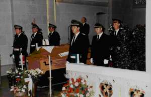 1986: Vorstände der Schützenvereine halten Totenwache am Sarg von Pastor Josef Pletziger und fahren in großer Zahl zur Beisetzung nach Fröndenberg.